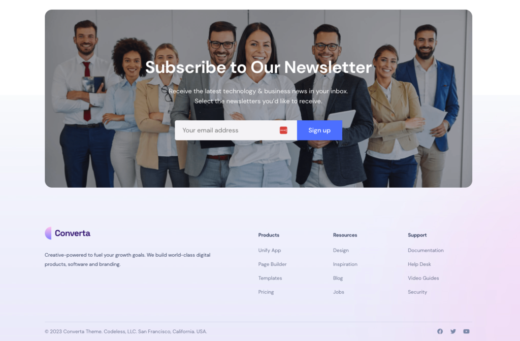 Allows users to add custom sections above or below the main footer section, like subscribe, forms, blog etc.